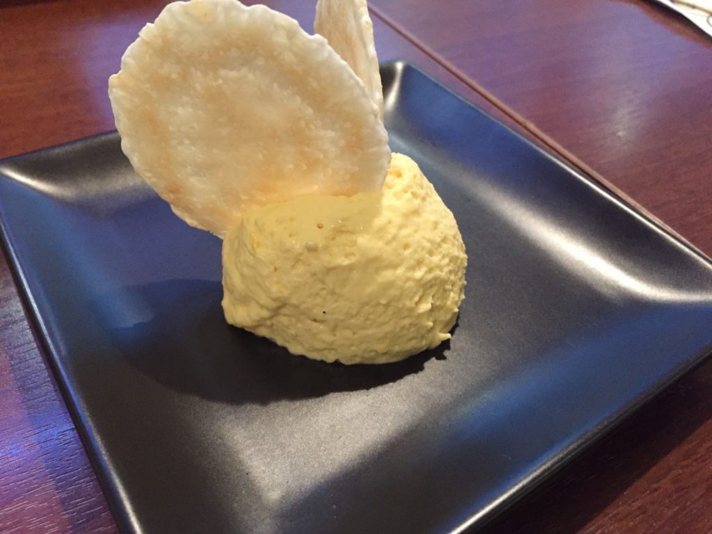 前菜はコーンポタージュ味のペーストにクラッカーを刺したものです。