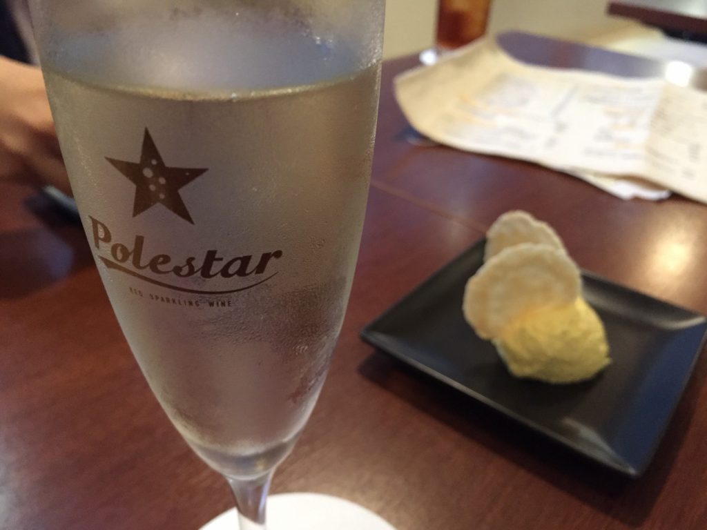 シュワッ、キリッとしたスパークリングワインと少し甘い味付けの前菜がよく合う。