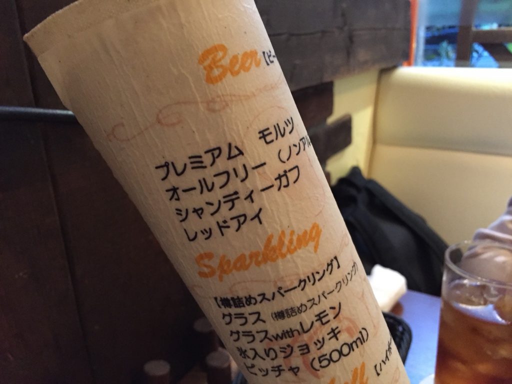 ドリンクとフードのメニュー表。ただの神ではなく、羊の皮のような少し丈夫な素材。