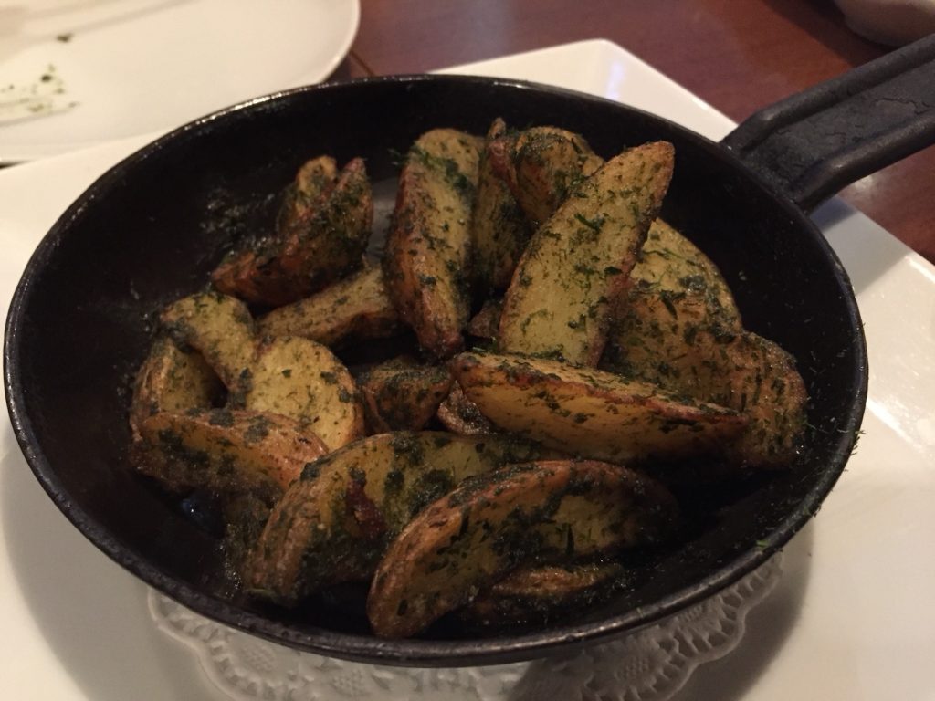 ロースステーキの150gとアンチョビと青のりのフライドポテトを注文。加えて、タコのパスタ、