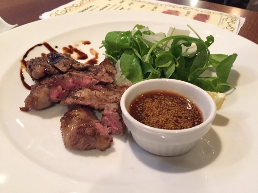 メインディッシュ登場。リブロースステーキ。ゆずこしょう、ガーリック、特製ソース、の3種類の味付けで