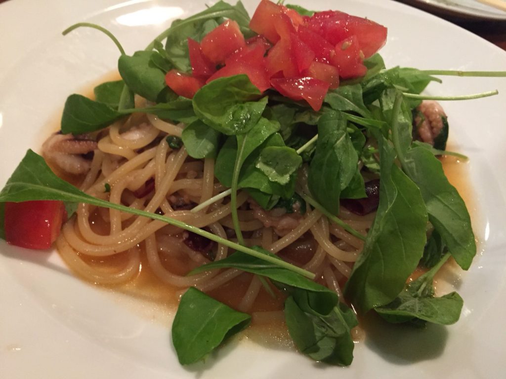 最後に出てきたのは、タコのペペロンチーノパスタ。追加料金300円で生パスタ麺に変更し、さらにもうプラス300円し、