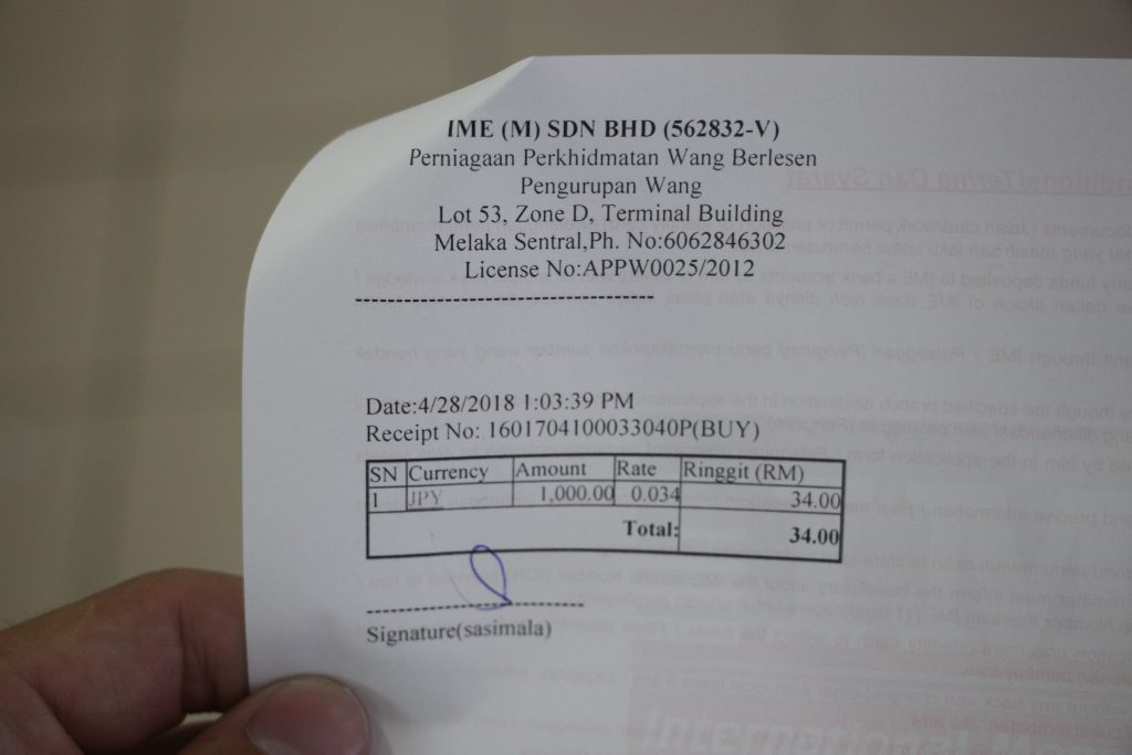 両替所のお店「Ria」を見つけたので、必要額だけ両替。1,000円を34リンギットに。レートは空港と一緒ぐらいです。